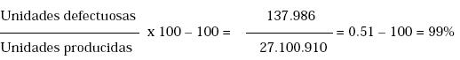 Este indicador es de gran importancia para llevar el control de calidad donde informa el grado de confiabilidad del proceso. Se obtiene de relacionar las unidades defectuosas y el total de unidades producidas consiguiendo un porcentaje de defectuosos; este porcentaje se resta del ciento por ciento (100%) de calidad que es lo óptimo.
