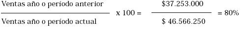 Este indicador nos muestra qué porcentaje de las ventas actuales son las ventas del año o período anterior, medido en pesos; para lo que se debe tener presente que allí entra en juego el índice de inflación del respectivo año. Lo anterior para poder medir en forma real el crecimiento obtenido.