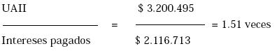 Capacidad de la empresa para efectuar los pagos contractuales de interés. Mide la incidencia que tienen los gastos financieros sobre la utilidad operacional de la empresa. Su resultado se interpreta como el número de veces en el que la utilidad operacional es superior a los intereses pagados.