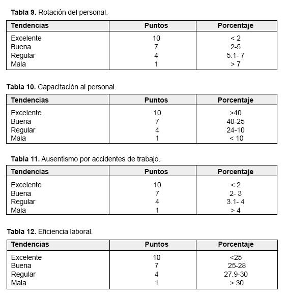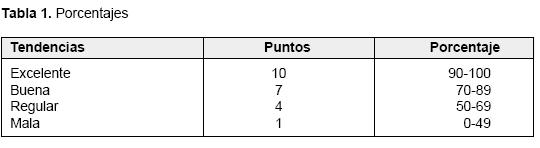 Se tendrá una tabla donde se establece la tendencia y la calificación, a cada tendencia, según el resultado del indicador, se le da un puntaje, el máximo de puntos a obtener por tendencia excelente es de 10 puntos.