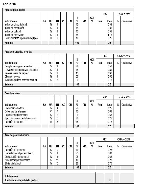 La sumatoria de las cuatro áreas dará el resultado o evaluación integral de la empresa, la que se puede medir en forma cualitativa y cuantitativa, según las tablas de referencia que se enuncian más adelante.