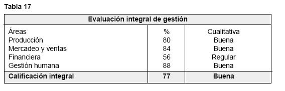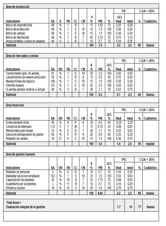 El cuadro-resumen anterior muestra la calificación integral de la gestión de la empresa. En este caso del ejemplo para una empresa industrial del subsector de cosméticos, para un período de un año. Los directivos, y cualquier ente o persona interesado en el funcionamiento de la empresa, podrá tomar las decisiones del caso, ya sean correctivas, como en el área financiera, cuyo desempeño fue regular en el período evaluado; o de reforzamiento e incentivos para otras áreas como la de recursos humanos, cuyo desempeño fue bueno. No obstante la meta es la excelencia, por lo que esta empresa deberá seguir buscando alternativas y estrategias para lograr su óptima meta en cada una de las áreas.