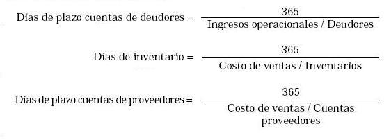 Estas tres razones financieras (días de inventario + días de cuentas deudores - días de cuentas proveedores) se integran en la estimación del CCE según la propuesta de Richards y Laughlin ya mencionada que sirve de base para el presente análisis.