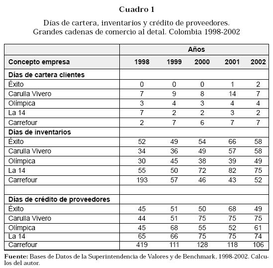 El Cuadro 1 muestra los datos de días de cartera clientes, de inventarios y de crédito de proveedores obtenidos a partir de las cifras reportadas en los estados financieros de la base de datos de la Superintendencia de Valores (en los casos de Almacenes Éxito, Carulla y Olímpica que tienen sus acciones inscritas en Bolsa), de la base de datos Benchmark (en los casos de La 14 y Carrefour) y de la aplicación de las tres fórmulas ya señaladas en el punto 2 del presente artículo.