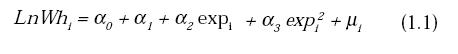 En la ecuación (1.1) LnWhi corresponde al logaritmo natural del salario por hora para el i-ésimo individuo, si es la educación del individuo i y exp representa los años de experiencia en el mercado laboral del i-ésimo y µi es el término aleatorio de error y, la tasa de rendimiento estimada para un año adicional de educación será α1.