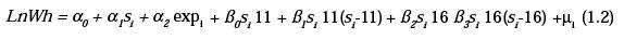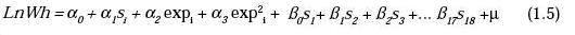 En la ecuación (1.5) LnWh es el logaritmo natural del salario por hora, Si son el número de años de educación aprobados, Expi es la experiencia potencial (edad-S-6), Exp2i es la experiencia al cuadrado, la variable Si es una dummy con valor de 1 si el individuo ha aprobado i años de educación y 0 en otro caso, para i = 1, 2, ..., 18.