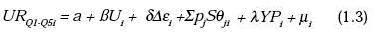 En la ecuación (1.3), UR Q1 - Q5i representa las desigualdades en el empleo entre los quintiles uno y cinco de ingreso, Ui corresponde a la tasa de desempleo global, Δεi denota el índice que mide las diferencias en el logro educativo entre los quintiles, Sθji es la distribución del empleo según los sectores económicos j, SPi la desviación estándar de los ingresos laborales (utilizada como medida de dispersión salarial), y YPi la participación juvenil en cada una de las ciudades.