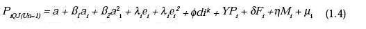 En la ecuación (1.4) ai corresponde a la edad del individuo i, e representa el logro educativo en años de escolaridad del individuo i, diK es una variable dicotómica que capta el efecto adicional sobre la probabilidad de desempleo de un nivel de educación K en el individuo i, Pi denota la tasa de desempleo familiar del individuo, el Ingreso total de la familia del individuo i exceptuando su propio ingreso total, y M es una variable dicotómica para identificar la población activa inmigrante.