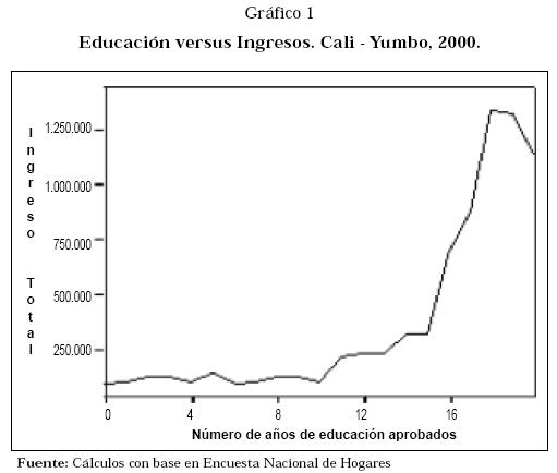 Adicionalmente el Gráfico 1 muestra la relación entre los años de estudio aprobados y el ingreso de los trabajadores. La curva de ingresos tiene pendiente positiva, con inclinación moderada hasta el dieciseisavo año de escolaridad, donde presenta un salto muy significativo. En este año se presume que el individuo ha culminado los estudios superiores. El salto en la curva puede sugerir la existencia de efectos diploma en el mercado laboral en Cali.