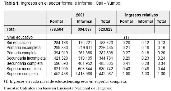 Antes de realizar las regresiones, una simple mirada de las cifras de los ingresos relativos de los trabajadores, según nivel educativo, muestran alguna evidencia de la importancia de los títulos en Cali - Yumbo para el sector formal. Por nivel educativo existe una muy amplia brecha entre los ingresos de los trabajadores, con educación superior y el resto de la población ocupada.7
