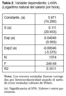 Los resultados obtenidos a partir de la ecuación Minceriana empleando la información disponible para el área metropolitana de Cali- Yumbo muestran que la tasa de retorno a la educación es del 11.1%. Este resultado es superior al estimado por Chávez y Arias (2002) para Colombia, equivalentes a 7.6% en el caso de los hombres y 10.7% para mujeres. Se observa también que la experiencia tiene una relación directa y significativa con los ingresos, mientras que la experiencia al cuadrado arroja un coeficiente negativo; este último resultado es un reflejo parcial del efecto marginal adverso de la edad de los individuos sobre el ingreso, pues las personas más adultas tienen menor facilidad que los jóvenes para vincularse a un puesto de trabajo.