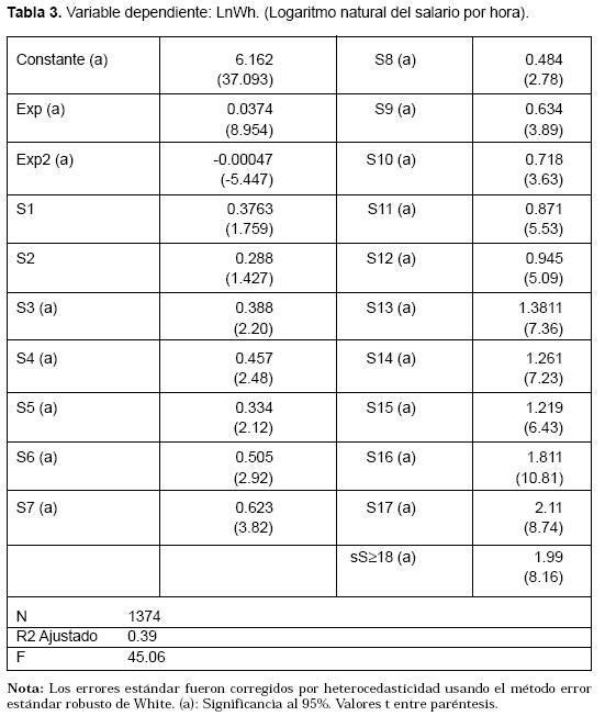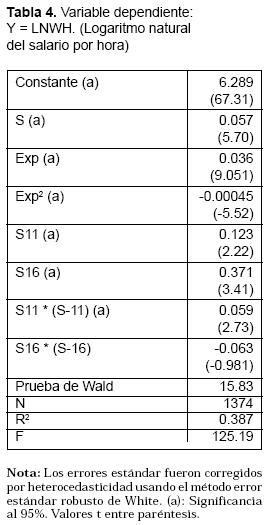 De los resultados de la anterior regresión se puede observar que la tasa de rendimiento media para los 10 años de educación es del 5.76%, para el año 11 de educación es del 18.05% y para los 16 años de educación es del 48.78%. Los resultados también muestran que los títulos de educación secundaria y universitaria son usados para señalizar (son estadísticamente significativos). Una prueba más formal consiste en realizar la prueba de Wald sobre β0 y β2, estableciendo como restricción que estos sean conjuntamente iguales a cero. Los resultados arrojan un valor de 15.83 el cual a un nivel de significancia del 95%, X295% = 5.99, permite rechazar la hipótesis de que conjuntamente sean iguales a cero, corroborando la hipótesis de que los títulos son importantes para la obtención de salarios y que sirven como mecanismo para señalizar en el mercado laboral de Cali.