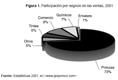 Como se observa en la Figura 1, el negocio más importante es el de las pinturas que representa el 73% de las ventas; el segundo es el comercio con un 9% de participación; y después, los químicos con un 7%. En el mercado colombiano de pinturas, para el año 2002, el GIM tuvo una participación del 90% dividida en Pintuco (65%), Terinsa (15%) e ICQ (10%) - esta marca fue adquirida en el 2002- . El negocio de pinturas está dividido en cinco categorías: el decorativo, que representa entre el 60% y el 65% del total de las ventas, el automotriz, que tiene un peso del 8% ó el 10%, el de mantenimiento con el 10%, el industrial con el 15% y el de pintura en polvo, cuya participación en el negocio es de aproximadamente el 5%.