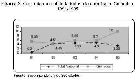 La apertura económica que se dio en la economía colombiana a comienzos de los años noventa fue uno de los motivantes para que el Grupo comenzara su proceso de internacionalización. Como se ilustra en la Figura 2, durante los primeros años de esta década, el desempeño del sector químico estuvo por encima del comportamiento de la industria nacional.16 Las compañías de pinturas se vieron favorecidas con la apertura debido a que manejaban unos estándares de calidad por encima del promedio de la industria nacional, lo cual les dio una ventaja competitiva frente a productos de los países vecinos.