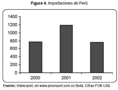 En la Figura 4 se observa que las importaciones peruanas de pintura de productores colombianos, sumaron para el 2001 US$1.184.000, uno de los años más fuertes. Sin embargo, a pesar de haber disminuido en el 2002 a niveles similares a los que tenían en el 2000, Perú sigue siendo un país con potencial para que los productos colombianos establezcan inversión directa.