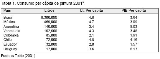 En promedio, los países latinoamericanos consumen alrededor de cuatro litros anuales de pintura por persona, sin embargo, hay diferencias notables entre algunos de ellos. En la Tabla 1 se observa que el consumo de pintura per cápita de Brasil (4.8 l) es más del doble que el de Colombia (2.1 l). Por su parte, en Estados Unidos, el consumo está alrededor de 16 ó 17 litros, en Europa, de 18 ó 19 litros; y en los países escandinavos de 24 ó 25 litros de pintura per cápita anual.
