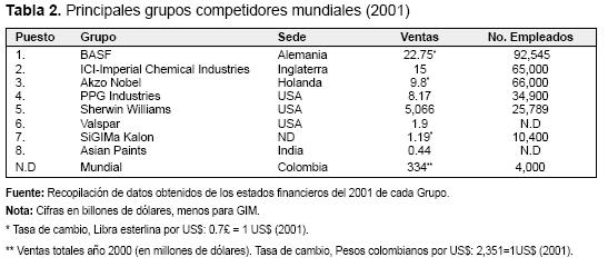 En la primera posición se encuentra el Grupo BASF. El segundo lugar lo ocupa el Grupo ICI que tiene una participación a nivel geográfico de 46% en Norte América, 34% en Europa, 12% en Asia Pacífico, y 7% en América Latina. Su concentración es del 90% en el negocio de pinturas y cuenta en la actualidad con 200 fábricas distribuidas en todo el mundo. Por su parte, Akzo Nobel, en el 2001 contaba con ventas por 14 billones de euros (9.8 billones de dólares), y con 66.000 empleados en 80 países. Las ventas de la unidad de negocios de pinturas Akzo Nobel "Coatings" durante el año 2001 fueron de 5.591 millones de Euros (US$ 3.913 millones). Finalmente, el GIM, con sede en Medellín, Colombia, para el 2002 tuvo ventas por 334 millones de dólares participando con el 80% en la producción local. A la fecha, Pintuco es el líder en el sector de pinturas en Colombia, es el mayor fabricante de químicos afines en la Región Andina y está entre los veinte productores de pinturas más importantes del mundo.