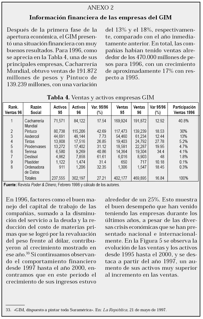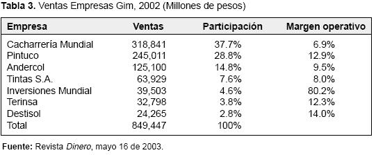 Las ventas de las empresas en Colombia, Venezuela y Ecuador para el año 2000, ascendieron a 670.000 millones de pesos, lo que significó un crecimiento de 29% en relación con 1999. De esa cifra, la mayor parte la representó Colombia, luego Venezuela que aportó el 30%, y después, con un porcentaje menor, Ecuador.14 En la Tabla 3, se observan las estadísticas para el año 2002 de las principales empresas del GIM en Colombia.