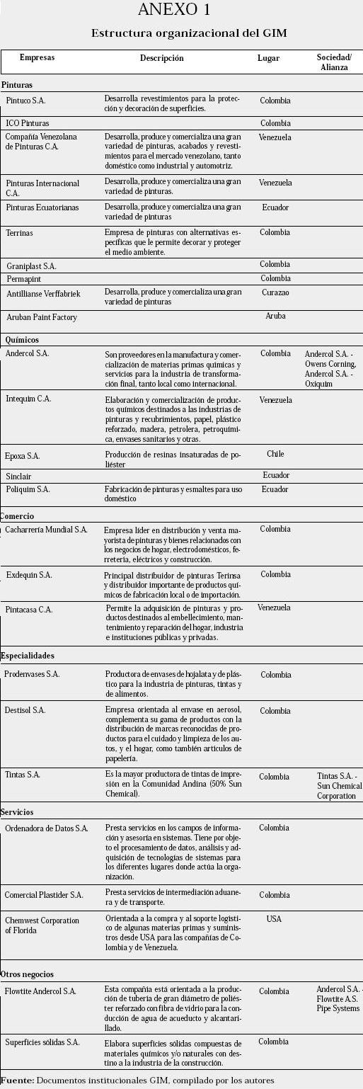 El GIM está compuesto por 27 empresas integradas verticalmente, que se agrupan en las divisiones de pinturas, químicos, comercio, especialidades y servicios. La estructura empresarial de todas las divisiones se puede apreciar en el Anexo 1.