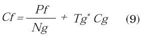 Donde Cf es el costo por vida de la herramienta, Pf es el precio de la herramienta de vástago sólido o carburo soldado, Ng número de veces que se puede reafilar la herramienta, Tg es el tiempo que tarda en afilar la herramienta y Cg es la tasa de afilaafilado. El costo total por unidad de producto (Cp) queda: