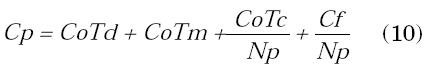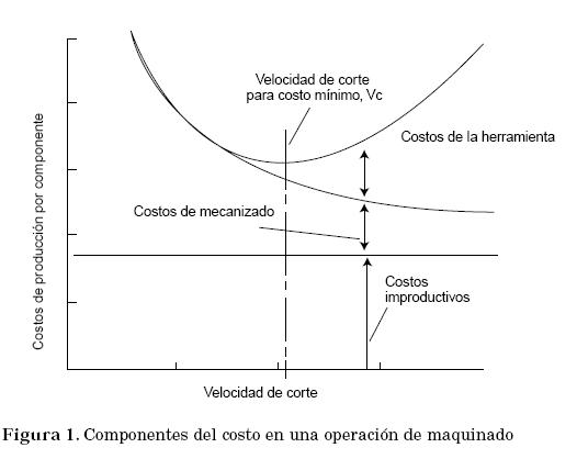 Donde Co es la tasa de costo para el operario y la máquina, CoTd es el costo de montar y desmontar la pieza, CoTm es el costo del tiempo de maquinado, CoTt/Np es el costo del tiempo del cambio de la herramienta y Cf/ Np es el costo de la herramienta por unidad del producto. Al aumentar la velocidad de corte disminuye el costo del tiempo de maquinado, pero aumenta el costo de la herramienta y el costo del tiempo de cambio de la herramienta y permanece constante el costo de montar y desmontar la pieza. En la Figura 1 se muestra cómo varía el costo de producción para diferentes velocidades de corte.