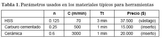 Muchas industrias metalmecánicas prefieren usar las herramientas reafilables de acero rápido debido a su bajo costo y reutilización, pero no tienen en cuenta otros factores determinantes en la economía del maquinado. A continuación se comparan los tres materiales para herramientas en las mismas condiciones: operación torneado de acabado, el tiempo de montar y desmontar la pieza de trabajo es de 2 min, el avance 2.54 mm/ rev y la profundidad 0.0127 mm. Las dimensiones de la pieza en bruto fueron: diámetro 57.15 mm y longitud 292.1 mm. En la Tabla 1 se muestran los parámetros C, n, el tiempo de cambio de la herramienta y el precio de cada material para herramienta.
