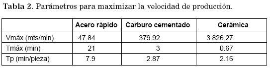 En la Tabla 2 se muestran los resultados para maximizar la velocidad de producción, para la herramienta cerámica la velocidad de corte es diez veces mayor que para el carburo cementado y ochenta veces mayor que el acero rápido. La vida de la herramienta es mayor para el acero rápido, pero el tiempo del ciclo de producción por pieza fue menor para la herramienta cerámica, seguida por la de carburo cementado y finalmente la de acero rápido. Es decir, que aunque inicialmente hay que hacer una mayor inversión para la herramienta cerámica finalmente se recupera con creces en el costo por unidad y la duración del ciclo. Las herramientas desechables son recomendadas porque el tiempo por ciclo y el costo por pieza son menores que para la herramienta reafilable.