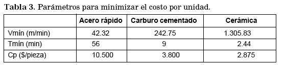En la Tabla 3 se muestran los resultados para minimizar el costo por unidad. Se encontró que el costo por unidad es menor para la herramienta cerámica, luego sigue la de carburo cementado y finalmente la de acero rápido. Las empresas metalmecánicas pueden escoger la velocidad de corte de acuerdo con las necesidades del momento, es decir, si tienen de moras con la entrega de los productos, es conveniente trabajar con la velocidad de corte para máxima velocidad de producción. De lo contrario, pueden trabajar con una velocidad de corte para minimizar el costo por unidad. Las empresas siempre deben trabajar en este rango de velocidad para optimizar el proceso de manufactura.
