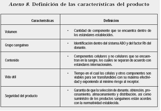 Aparte de esto, como el Banco de Sangre es una industria donde se recibe una materia prima que es la sangre que se procesa y de la cual se obtienen cuatro posibles productos (glóbulos rojos, plasma, crioprecipitado, plaquetas), se definieron las características del producto (Ver Anexo 10).