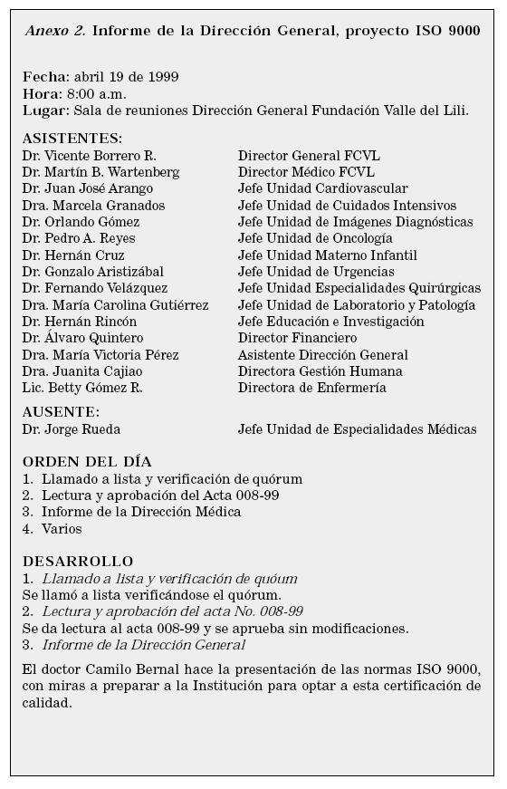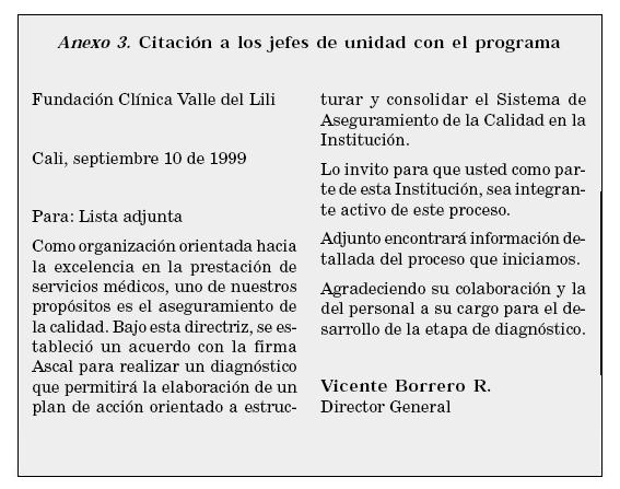 En abril de 1999, el Director General de la Clínica presentó ante el Comité Médico Ejecutivo, por intermedio de la compañía asesora, la propuesta para la futura implementación del Sistema de Gestión de Calidad bajo la norma ISO (Ver Anexo 2).