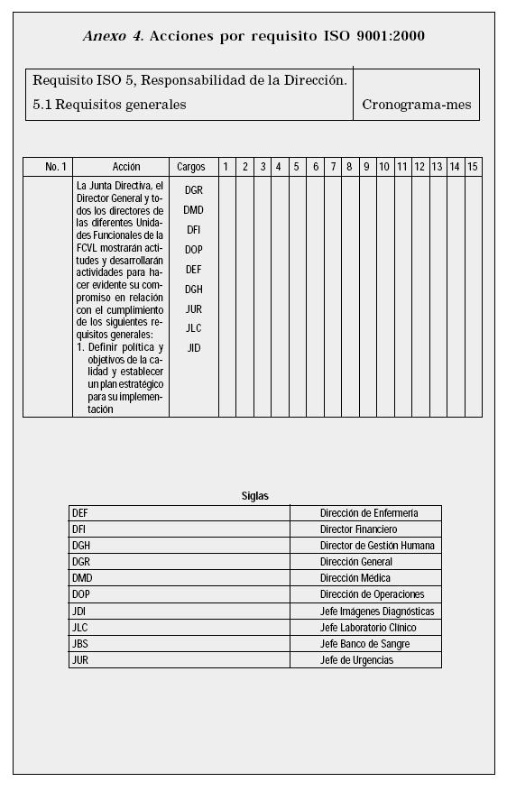 Se realizó el cronograma de implementación de actividades y se asignaron responsables de acuerdo con una guía de acciones por requisito ISO 9001:2000 la cual se divulgó en reunión conjunta con los jefes de las Unidades y Servicios , a la que asistieron además de los asesores y los jefes, personas líderes o claves de cada área. A esta reunión de divulgación se citó el personal de Admisiones, Compras, Farmacia, Mantenimiento, Administración de Personal, etc., para darles toda la información pertinente, revisar el plan propuesto, aclarar las dudas, hacer ajustes al plan de acción y aprobarlo en conjunto y definitivamente, puesto que se consideraron áreas de soporte para la prestación del servicio y por lo tanto deberían estar involucradas en el proceso.