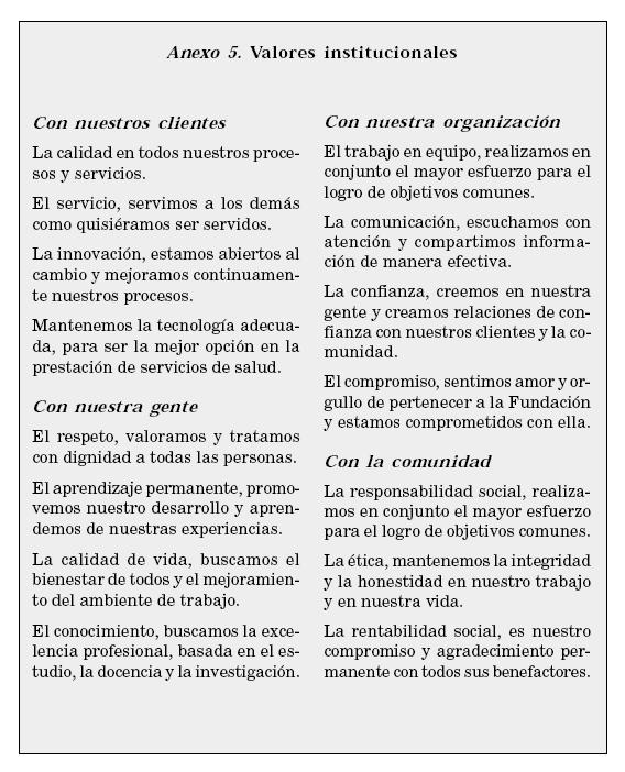 Este ejercicio fue de gran ayuda para aclarar e interiorizar los valores de la institución, con una cultura organizacional muy fuerte en ese momento y un gran sentido de pertenencia. Cada actividad realizada tenía un porqué y un para qué en ese proceso de certificación.