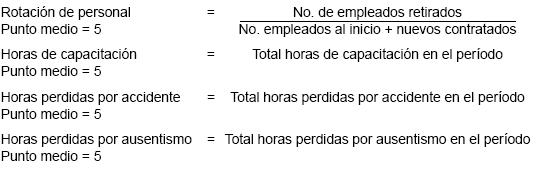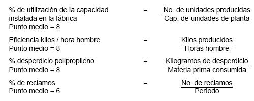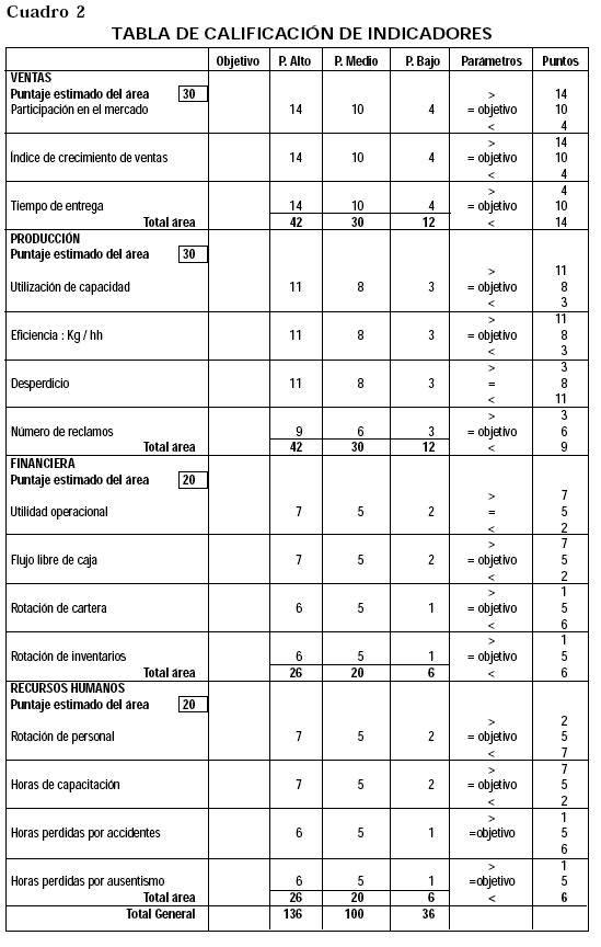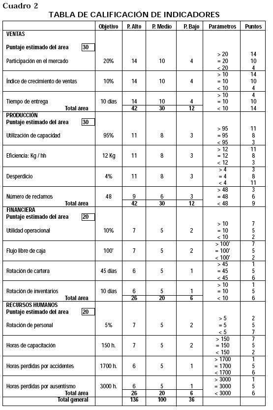 A cada área se le dio un porcentaje, distribuido en índices e indicadores determinados como los que pueden soportar la información requerida para la evaluación; cada índice o indicador tiene un objetivo determinado según lo que desea verificar (porcentajes, días, kilos, horas, número, etc.); y su calificación tiene tres puntajes: punto alto, punto medio, y punto bajo. Se hizo de tal manera que al sumar el punto medio éste fuera igual al puntaje total por área; esto indica que el punto alto está por encima del objetivo esperado, y el bajo denota deficiencia que hay que evaluar de inmediato.