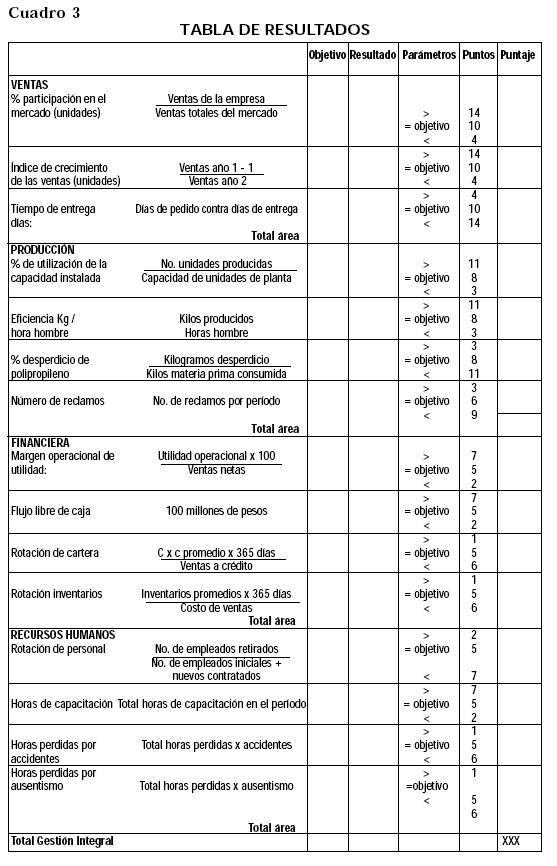 En este formato se incluye el objetivo ideal esperado para cada indicador que ha sido previamente definido por la organización, seguido del resultado real obtenido para el mismo en dicho período; dándole una calificación a cada uno, dependiendo de su comportamiento, ya sea por encima o por debajo del objetivo; puntos éstos que son sumados al final para definir la calificación del área y, mediante su sumatoria definir la calificación integral de la gestión.