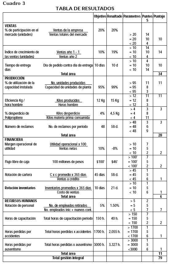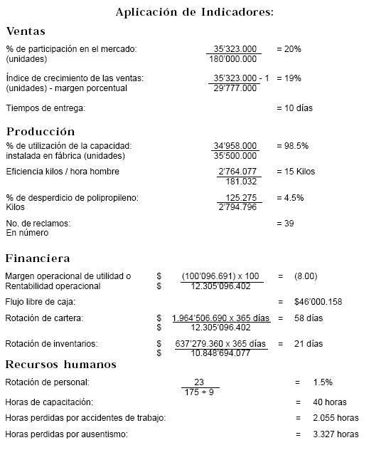A esta sección se le dio una puntuación, dentro de la calificación de las áreas, de 30 puntos, distribuidos dentro de los tres indicadores siguientes, estableciendo para cada uno un objetivo estimado. La información de esta área fue tomada de los estados de resultados promedio de las empresas del subsector por los años 2002 y 2003, de las publicaciones anuales de la Asociación Colombiana de Industrias Plásticas Acoplásticos, del control de pedidos anual, y del informe de costos de unidades producidas.