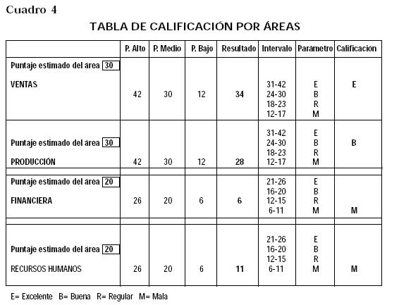 Después de hacer un análisis se establecieron como áreas susceptibles de ser medidas, y de que sus resultados fueron factores claves de decisión en esta clase de empresas, las siguientes: ventas, producción, financiera y recursos humanos, ya que en ellas converge todo el funcionamiento de la mayoría de empresas estudiadas.