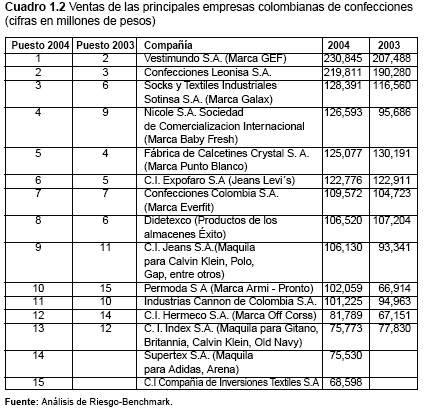 En el Cuadro 1.2 se presentan 15 de las principales empresas de confección que hay en Colombia. En el año 2003, Leonisa ocupó el tercer lugar en este ranking y en el 2004 –como lo muestra el cuadro– ocupó el segundo lugar en ventas a escala nacional.