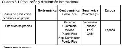 Leonisa vende sus productos en más de 20 países, en 11 de los cuales tiene presencia directa por medio de distribuidoras propias (ver Cuadro 3.1). Las plantas de producción están ubicadas en Colombia y en Costa Rica. La primera distribuidora que se montó fue la de Puerto Rico en el año 1986, y la más reciente es la de República Dominicana. Para el 2001, la distribuidora que tiene más empleados vinculados de manera directa es la de Chile, mientras la que más factura, alrededor de 10 millones de dólares anuales, es la de Puerto Rico.