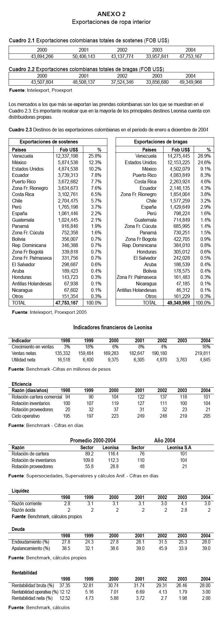 Leonisa es una empresa colombiana de ropa interior, cuya presencia internacional, principalmente en mercados latinos, representó en el año 2004 el 35% de sus ventas totales.1 Debido al alto grado de reconocimiento que tiene en Colombia y en un buen número de países latinos, Leonisa es un interesante caso de la forma como una empresa proveniente de un país en vía de desarrollo como Colombia, ha logrado incursionar con éxito en el mundo de la confección internacional.