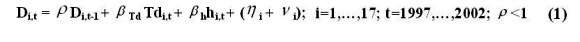 En la ecuación (1) Di,t son los despidos cuyas sentencias fueron a favor de los trabajadores en la comunidad autónoma i, Td la tasa de desempleo, h el número de huelgas, hi la heterogeneidad no observable entre las comunidades autónomas y ni,t el término idiosincrático de error. En la ecuación (1) ρ mide el grado en el cual el estado, en el último periodo, afecta directamente el estado en el periodo corriente y es una medida de la dependencia verdadera del estado, después de controlar por la heterogeneidad no observable ηi. De esta forma, el valor de ρ mostrará la predisposición de los jueces a fallar a favor de los trabajadores. Por otro lado, dicha predisposición se verá afectada por factores como el desempleo y las huelgas. De tal forma, es de esperar que a mayor tasa de desempleo y huelgas los jueces muestren una mayor inclinación hacia los trabajadores que hacia los empleadores.1