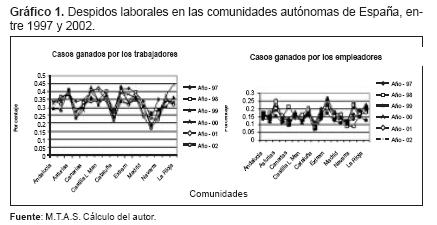 El Gráfico 1 muestra una gran variación, entre un 16% y un 44%, del número de casos ganados por los trabajadores en las comunidades autónomas españolas. La comunidad autónoma de Murcia registró, en el periodo analizado, el menor porcentaje de casos ganados por los trabajadores. Con respecto a los casos ganados por los empleadores la comunidad donde más casos se presenta es Extremadura, seguido de Asturias. También se puede observar que debido a que pueden existir conciliaciones o desistimientos las gráficas de casos ganados por uno u otro grupo no son inversas. La Gráfica 1 muestra una situación muy particular de España, ya observada por Bertola, Boeri y Cazes (1999), y que consiste en que los trabajadores ganan más casos de despidos en las cortes que los empleadores. Al respecto, Jimeno y Masagué (2003) plantean que la dificultad de justificar ante las Magistraturas de Trabajo los causales de despido ha llevado a que las sentencias resulten en su mayoría favorables a los trabajadores.