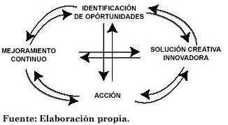 Cuando se aplican esas nociones básicas a cualquier proceso empresarial exitoso y en especial a un empresario exitoso, se encuentra que ellas se pueden convertir en un modelo de transformación caracterizado por cuatro elementos, los dos primeros asociados a la noción de cambio, y cada uno de los otros asociados a las nociones de acción y de mejoramiento. Estos cuatro elementos del modelo de transformación, indicados gráficamente en la Figura 1, son: