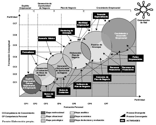 Este modelo comprende dos ejes de desarrollo de competencias: por un lado el eje vertical que nos representa las competencias de conocimiento (CC) y que deben de llevar al empresario de unas condiciones iniciales que se definirán al inicio del proyecto, a un perfil ideal que le permita tener todos los conocimientos y las experiencias técnicas para operar la organización; por el otro lado el eje horizontal que nos indica el desarrollo de las competencias personales (CP) en términos de habilidades o actitudes que debe desarrollar el empresario para poder liderar adecuadamente el proceso de construcción de su organización. El detalle de las competencias propias a la formación conceptual y a la formación personal deberán ser desarrollado por cada institución de acuerdo con sus características propias y únicas.