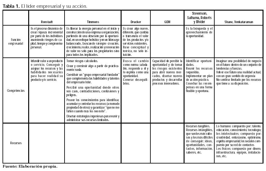 Existen muchísimas definiciones del líder empresarial y de su forma de actuar, las cuales están resumidas en la Tabla 1. Estas definiciones son vitales para establecer las competencias que se deben desarrollar en el proceso formativo del líder empresarial y algunas de ellas se presentan en forma resumida en la Tabla 1, que las asocia a la función empresarial en sí, las competencias y los recursos necesarios para llevar a cabo dicha función.