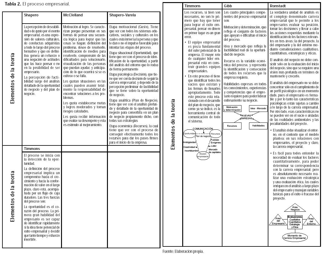 Para el entendimiento del proceso empresarial propiamente dicho, es bueno recordar los planteamientos de: Shapero, McClelland, Ronstadt, Timmons, Gibb, que están resumidos en la Tabla 2.