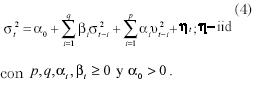 Usualmente, los trabajos empíricos emplean modelos estadísticos como el de heteroscedasticidad condicional auto-regresiva generalizado, GARCH(p.q) por su nombre en inglés. Este modelo implica que: