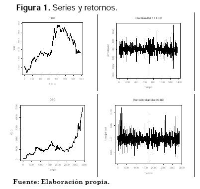 En la Figura 1 se pueden observar tanto la serie de la TRM en Colombia para el período comprendido entre el 25 de septiembre de 1999 y el 31 de abril de 2005 (Tomada de la base de datos del Banco de la República), y el IGBC para el período 21 de enero de 1991 a 21 de febrero de 2005 (tomado de la base de datos de Economática), así como sus rendimientos (sólo se incluyen los días laborales del período).