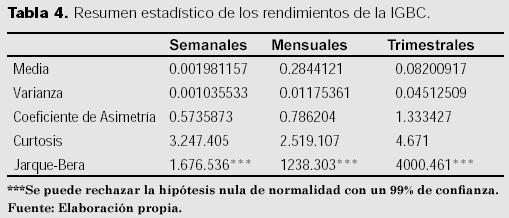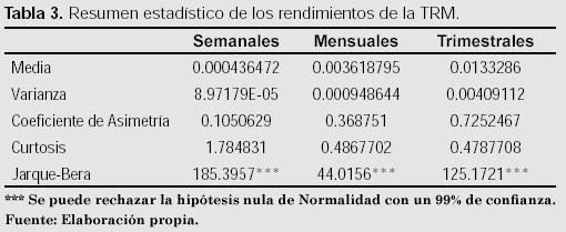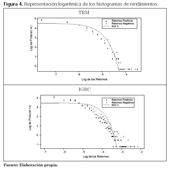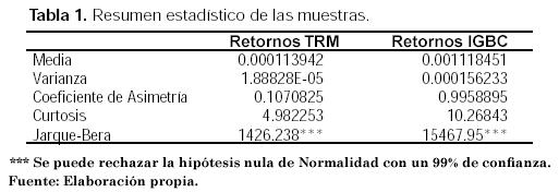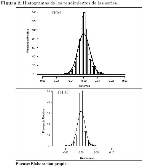 Como era de esperarse, las estadísticas descriptivas también refuerzan la evidencia a favor de la no-normalidad de la rentabilidad diaria. En ambos casos es claro que las distribuciones muestrales son leptocúrticas (dada la curtosis superior a 3). También existe alguna evidencia de asimetría, aunque como lo puntualizan Guermant y Harris (2002), en presencia de exceso de curtosis dicha asimetría es difícil de interpretar.