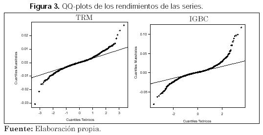 En la Figura 4 podemos ver cómo la probabilidad de los valores extremos de las muestras es mucho mayor que lo esperado en la normal. Así, estas dos series son un buen ejemplo del hecho estilizado de que los rendimientos son leptocúrticos y presentan colas pesadas. Este hecho ha obligado a que se adopten aproximaciones como la teoría de los valores extremos al momento de estudiar los rendimientos de los activos, en especial porque los valores extremos son los más importantes para los actores de los mercados financieros y reguladores.