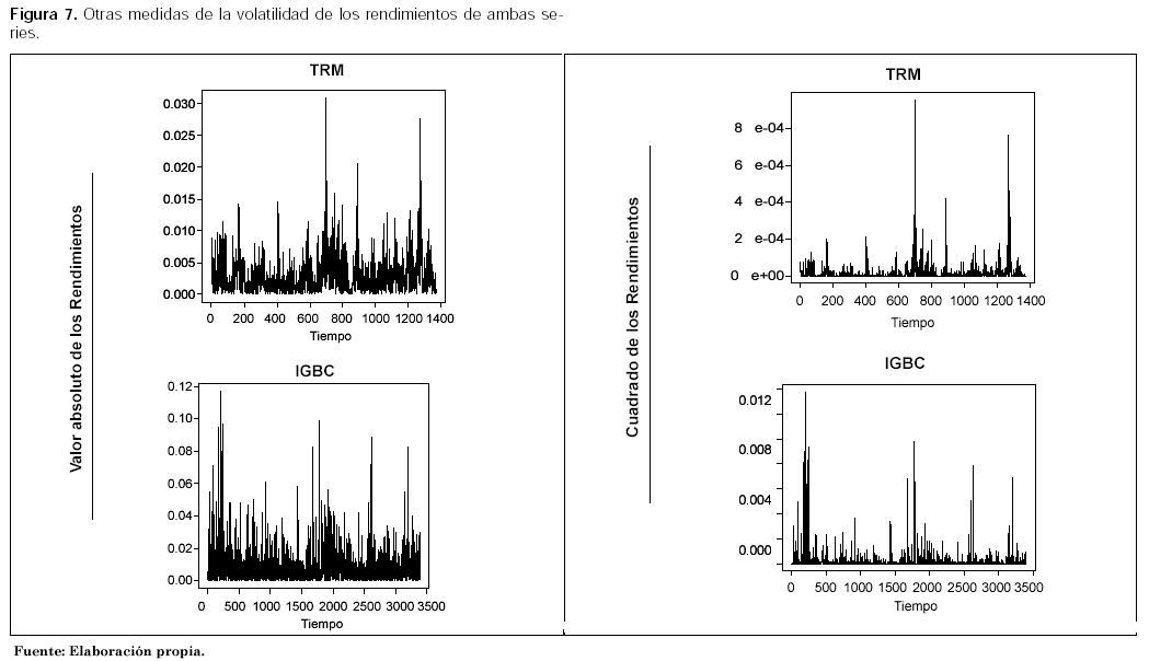 Como se puede observar en la Figura 6, empleando diferentes ventanas, la volatilidad de las series de los rendimientos no es constante a través del período de estudio. Hay otras formas de medir la volatilidad (y demostrar que no es constante) como emplear el valor al cuadrado de los rendimientos o su valor absoluto.3 Cualquiera de estas medidas mostrará el mismo fenómeno: la volatilidad de los rendimientos no es constante (Ver Figura 7).